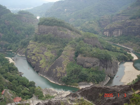 武夷山風景區東西寬約5公里,南北長約14公里,面積60平方公里。有九曲溪、溪南、水簾洞、碧石巖、桃源洞、三仰峰、武夷宮、云窩等景點,屬典型的丹霞地 貌,素有“碧水丹山”、“奇秀甲東南”之美譽,是首批國家級重點風景名勝區之一,被國際旅游組織執委會主席巴爾科夫人稱為“世界環境保護的典范”。武夷山是《洞天福地記》(杜光庭)里的三十六洞天之一!叭 水清如玉,六六奇峰翠插天”,構成了奇幻百出的武夷山水之勝!跋,山環六六峰”,“曲曲山回轉,峰峰水抱流”﹔臨水可觀山景,登山可望水秀,乘上一 葉竹筏游覽世間一絕的九曲溪,順流而下,山沿水立,水隨山轉,山光水色,交相輝 映,三十六峰、九十九巖一覽無余,其間更有距今約3800年前高插于懸崖峭壁之上的 船棺,令人嘆為觀止.....