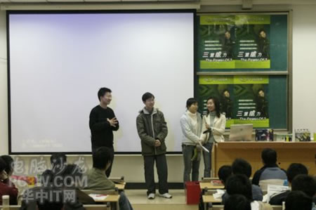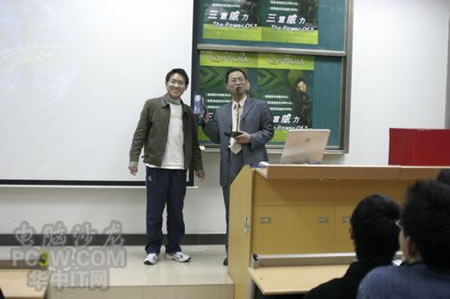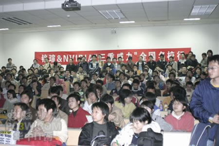 講座首先由商科集團武漢分公司天行電腦的唐平安先生發言,他首先詳細的向大家解釋了銘瑄NVIDIA“三重威力”的定義。并就“三重威力”的具體內容SM3.0、HDR以及SLI逐一做了詳細的說明,并分析了未來顯卡的發展趨勢。他生動詳細的演講讓在場的同學們聽得聚精會神,對其產品有著濃厚的興趣。