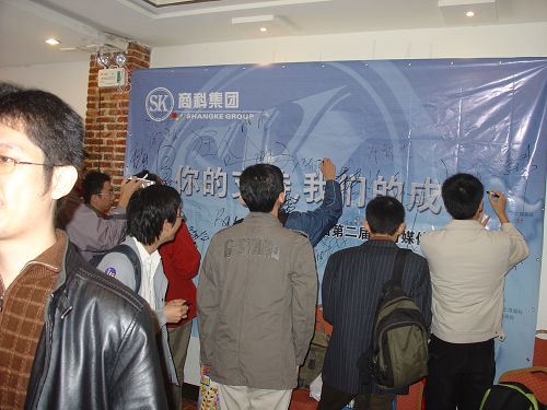 在會議結束的最后,我們請上了所有的媒體精英們在我們準備的背景板上寫下了對商科的祝福,明天會更好!