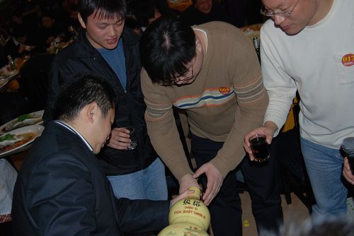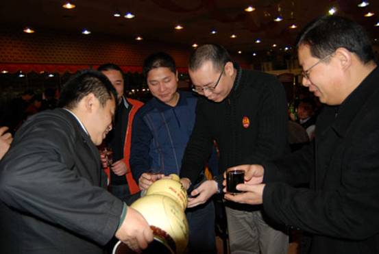公司孫總為各位經(jīng)理們倒酒,這酒瓶不是一般的大,喝下去也不是一般的勁啊!