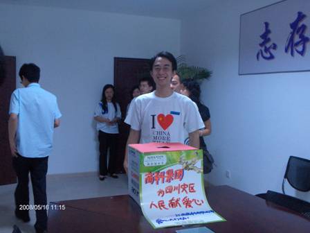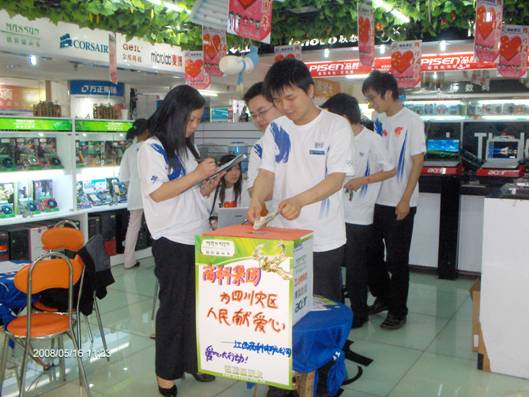 1、一方有難八方支援一直是中華民族優良的傳統,天災無情人有情,在我們的兄弟姐妹正在受到災難折磨的時候,作為一個有良知的中國人,我們是不是更應該拿出自己的一片愛心,有人的出人,有力的出力,用我們的愛心來支援一下災區的同胞們?江西商科電腦公司吳暉經理率先向災區進行了愛心捐款。