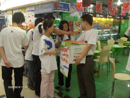 3、公司愛心募捐進行到了第二階段,,因為我們的心在痛,我們都在行動!南廳DIY門市部的員工在募捐現場。
