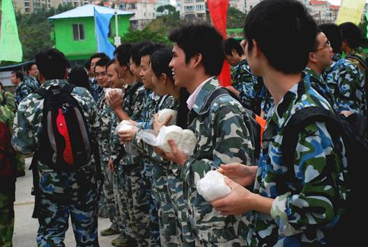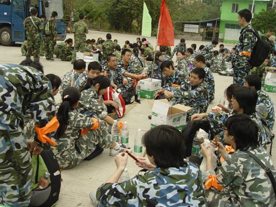 在做完熱身運(yùn)動后,拓展活動也拉開了序幕。 既然是集體活動,集體的概念也是最基本的。在教練的帶領(lǐng)下,近200名商科同事劃分為7個小隊(duì)。教練給出15分鐘時(shí)間,要各小隊(duì)決定自己的隊(duì)名、口號、隊(duì)歌和隊(duì)伍造型。 二、別開生面的午餐 在進(jìn)行了隊(duì)伍風(fēng)采展示后,時(shí)間已經(jīng)12點(diǎn)多了,現(xiàn)在該補(bǔ)充點(diǎn)能量了。今天的午餐是什么呢。沒有大魚大肉哦。