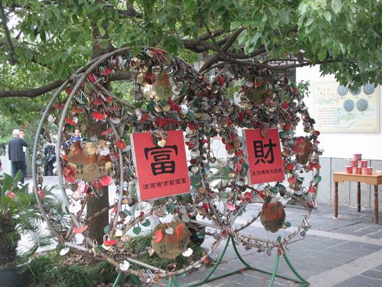 千島湖 我們一行隨導游坐船來到了湖上,放眼望去,整個湖面相當的清澈,千島競秀,群山疊翠,若隱若現,朦朦朧朧。湖面上,一座座蒼翠欲滴的小島星羅棋布,遠處水天相接處煙波浩渺、大氣磅礴,近處湖水顯出深碧色,像一塊碩大無比的翡翠,湖邊細浪在微風的吹拂下輕柔地拍打著岸邊, 令人心曠神怡。 稍作休整我們到達游湖的第一站鎖島。鎖島的面積不大,但卻是一個鎖的天地。整個島上,設置了多個掛鎖許愿的區域,游客通過掛開心鎖、同心鎖、友誼鎖、吉祥鎖、功德鎖等等,把對生活的美好祝愿留在鎖上。
