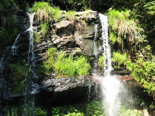 沿著曲折的棧道,我們難得看到兩支瀑布一大一小在同一巖石上傾注,猶如夫妻朝夕相伴,夫妻瀑布是也。 景致最美的是小黃果樹瀑布,瀑高20余米,瀑寬約15米,貼石壁傾斜而下,水勢滔滔,水流飛泄時,因碰撞凹凸不平山巖而產生水花四濺,飛飛揚揚,猶如大霧彌漫,雄渾瑰麗。