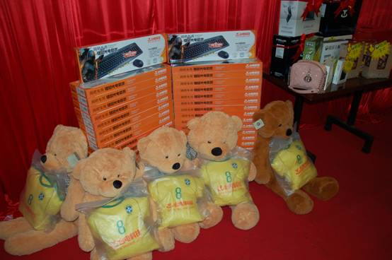 本次晚宴除開(kāi)幾個(gè)大獎(jiǎng)以外,也特意為到場(chǎng)的每一位經(jīng)銷商朋友準(zhǔn)備了鼓勵(lì)獎(jiǎng),獎(jiǎng)品分別為臺(tái)電U盤。攝像頭。鍵鼠套裝。電影票。抱抱熊等等,作為禮物送給了所有朋友。。