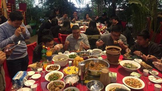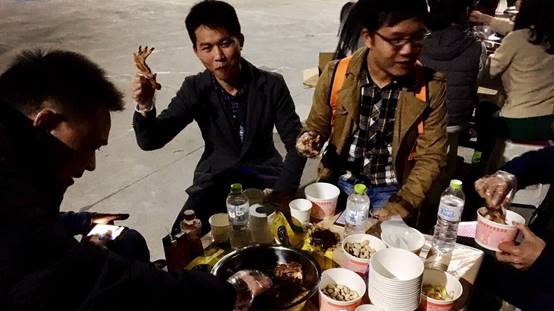 大家走了半天,終于到了午飯時(shí)間了,好菜可多啦,大家圍坐在一起,吃這頓豐盛的中午飯,有說(shuō)有笑。