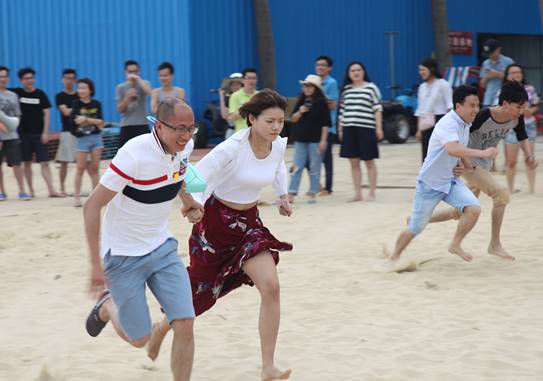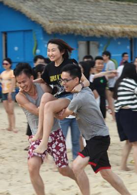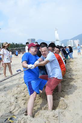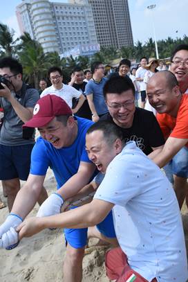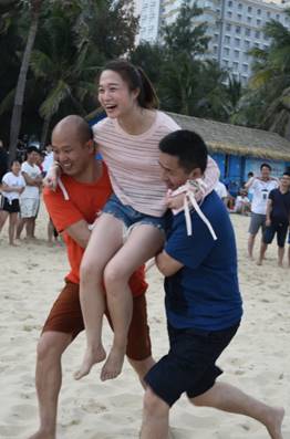 接下來是歡樂的趣味接力活動(dòng)啦,這一環(huán)節(jié)講究的不僅是速度,隊(duì)員的配合也十分重要。雙人夾氣球、背人跑、雙人咬紙巾、抬人跑、轉(zhuǎn)圈跑,大家玩的不亦樂乎,加油聲、呼喊聲、笑聲充斥著整片沙灘!