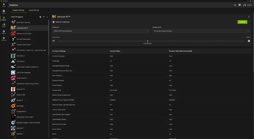 對于游戲玩家來說,圖形設(shè)置十分重要。現(xiàn)在通過NVIDIA App,用戶只需點擊“優(yōu)化”按鈕,即可自動配置游戲的所有設(shè)置,并啟用包括 DLSS 和 Reflex 在內(nèi)的 NVIDIA 技術(shù),還可以通過 NVIDIA 控制面板中的“管理 3D 設(shè)置”進一步配置游戲和應(yīng)用,以全局或針對某個游戲啟用和覆蓋驅(qū)動功能。NVIDIA app 將所有這些選項集成在一個易于訪問、響應(yīng)迅速的“圖形”選項卡中。