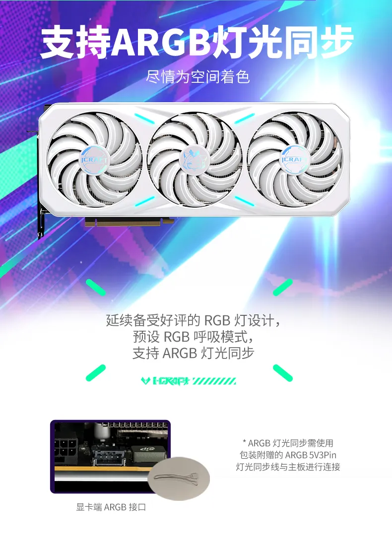 銘瑄GeForce RTX 4070 Ti SUPER iCraft ARGB OC16G璦珈顯卡延續(xù)備受好評的RGB燈設(shè)計,預(yù)設(shè)RGB呼吸模式,同時支持ARGB燈光同步,讓用戶無論是在激烈的游戲競技中,還是靜謐舒緩的學(xué)習(xí)創(chuàng)作中都能增添更多樂趣。