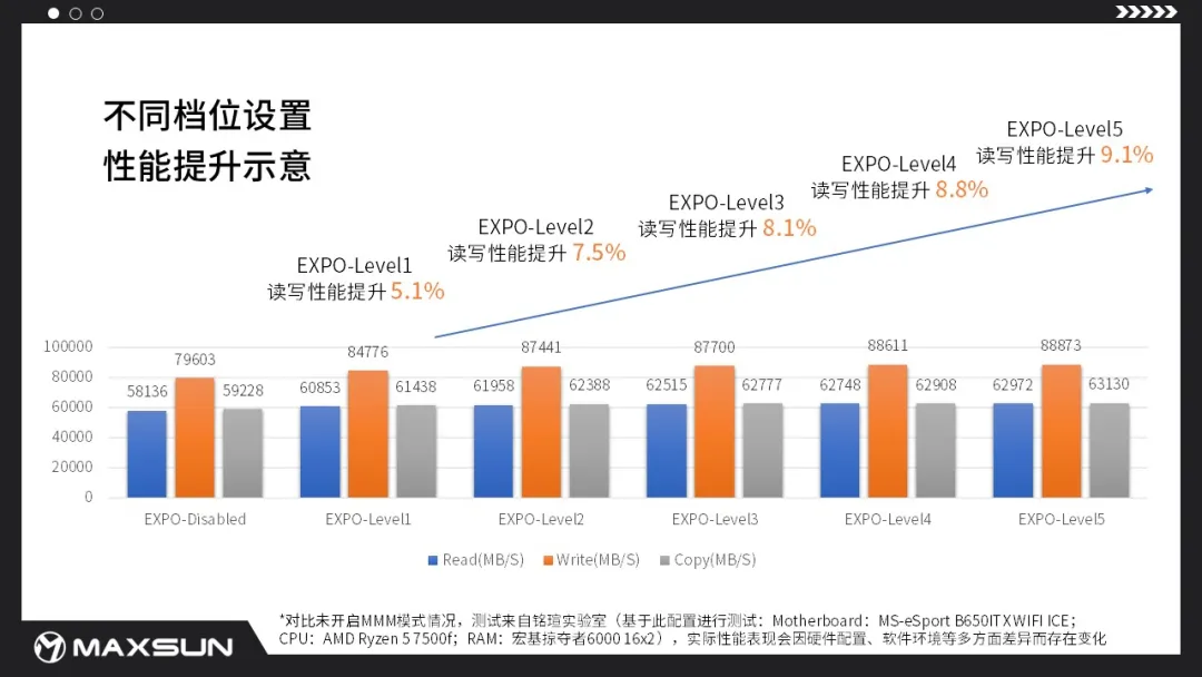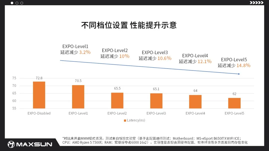 據(jù)銘瑄實(shí)驗(yàn)室實(shí)測,開啟MMM模式Level5后對比未開啟MMM模式,讀寫性能提升9.1%,延遲減少14.8%,性能提升表現(xiàn)卓越(注:實(shí)際性能表現(xiàn)因硬件配置、軟件環(huán)境等多方面差異而存在變化,因架構(gòu)差異原因,銳龍8000系列不支持該功能)。