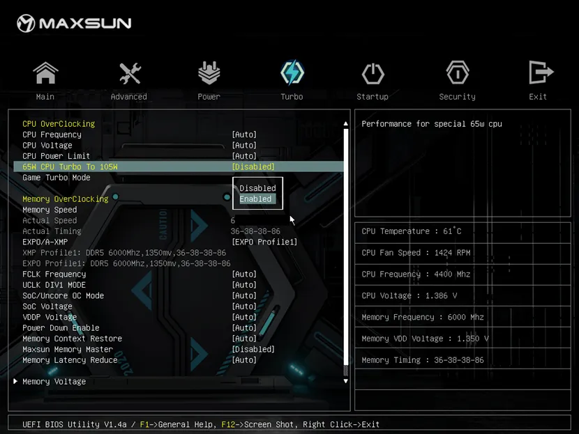 在Turbo頁面找到65W CPU TURBO TO 105W選項(xiàng),選擇Enable/打開 后按F10保存,重啟后即可生效。