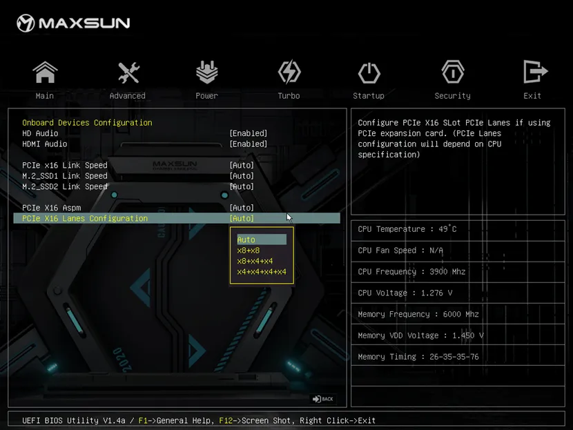 AMD B650芯片組提供PCIe 16X通道拆分功能,但大多數(shù)主板只能支持2個(gè)8X拆分,甚至有部分主板不支持此功能,銘瑄在此基礎(chǔ)上進(jìn)行優(yōu)化,提供3個(gè)PCIe 16X通道拆分模式,滿足用戶不同的需求。3個(gè)PCIe 16X通道拆分模式分別為:X8+X8、X8+X4+X4和X4+X4+X4+X4,用戶可通過BIOS頁面中Advance(高級)—chipset Configuation(芯片配置)—PCIe X16 Lanes Configuration(PCIe X16通道配置)來設(shè)置此功能,從而根據(jù)自身需求更好地分配PCIe資源。