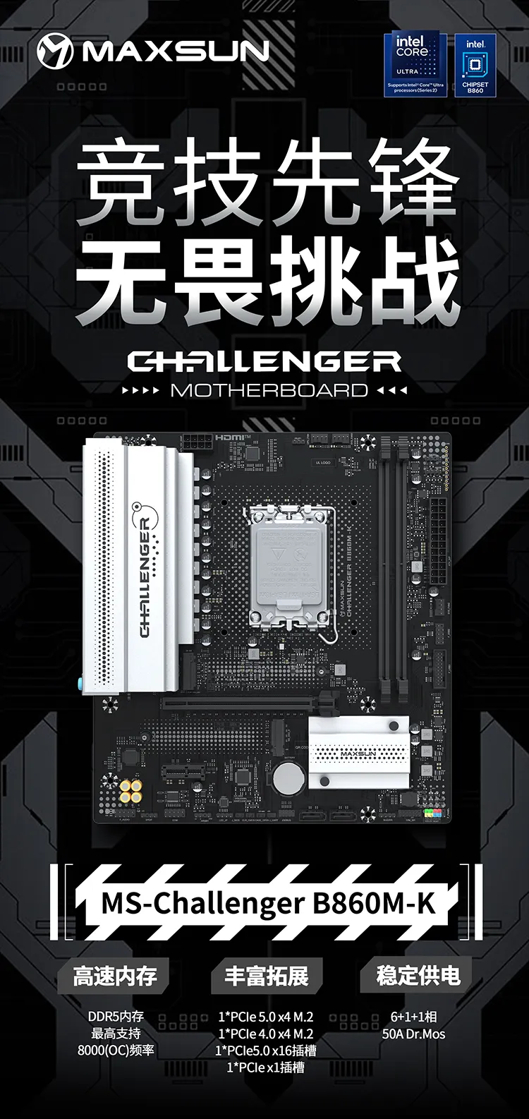 Challenger系列首發(fā)的MS-Challenger B860M-K同樣實力不凡,6+1+1相50A Dr.Mos穩(wěn)定供電,2*M.2滿速接口,2*PCIe拓展插槽以及多達10個USB口,功能多樣且性能可靠。