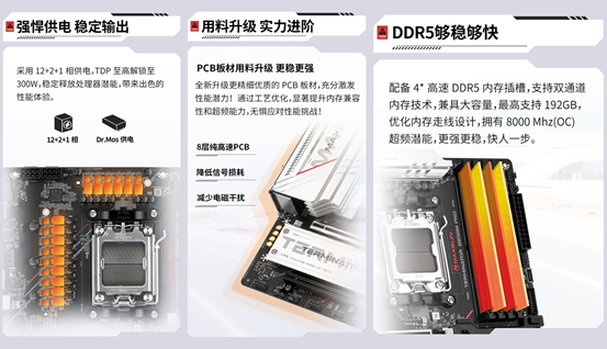 供電方面,該主板采用12+2+1相Dr.Mos供電設(shè)計(jì),TDP至高解鎖至300W,即使是搭配AMD銳龍7 9800X3D這類(lèi)高性能處理器,《三角洲行動(dòng)》高強(qiáng)度對(duì)戰(zhàn)等超高負(fù)載游戲場(chǎng)景,提供持續(xù)且穩(wěn)定的電力輸出,確保處理器性能完全釋放。讓你在激烈的槍?xiě)?zhàn)對(duì)決中,避免因供電不穩(wěn)導(dǎo)致的掉幀、卡頓,準(zhǔn)確把握每一個(gè)轉(zhuǎn)瞬即逝的作戰(zhàn)時(shí)機(jī),搶占對(duì)戰(zhàn)先機(jī)。