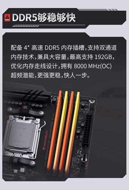 內(nèi)存方面,主板提供4*高速DDR5內(nèi)存插槽,擁有8000MHz(OC)超頻潛能,顯著提升響應(yīng)速度,讓你在學(xué)習(xí)和娛樂(lè)中快人一步。無(wú)論是多任務(wù)處理,還是進(jìn)行數(shù)據(jù)密集型操作,都能感受到內(nèi)存性能提升帶來(lái)的便捷體驗(yàn)。